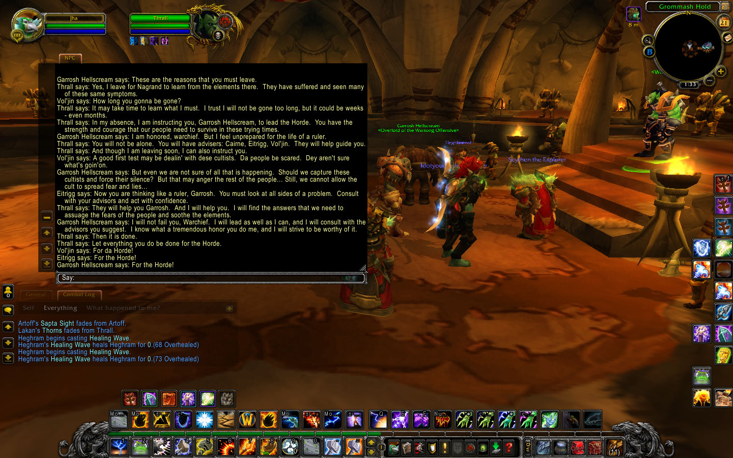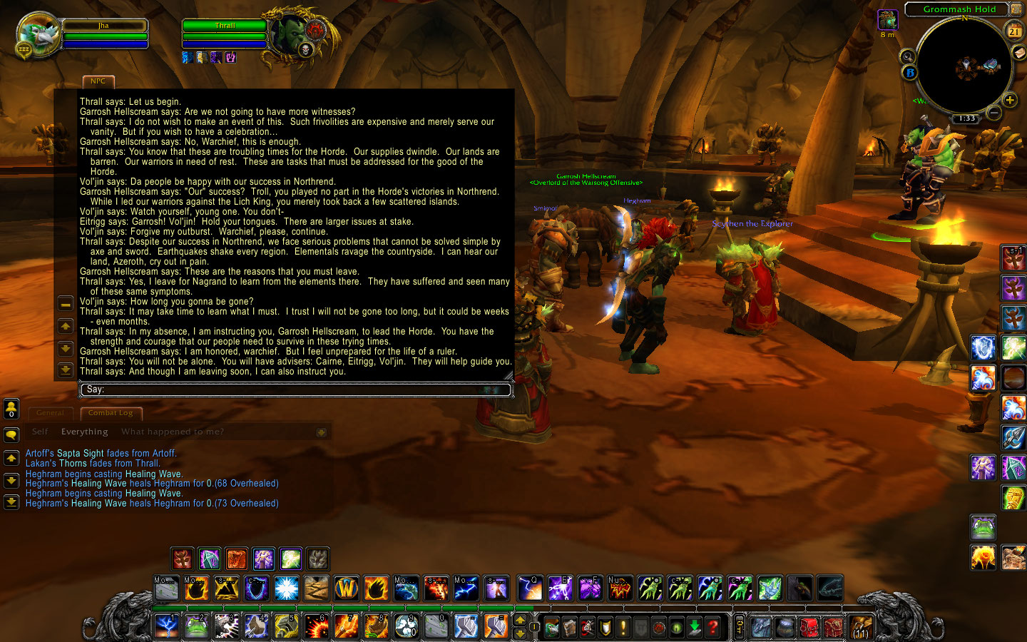 Thrall diz: Sim. Eu vou embora para Nagrand, para aprender sobre os elementais. Eles sofreram e viram, anteriormente vários desses sintomas. Vol’Jin diz: Quanto tempo ficará por lá? Thrall diz: O tempo necessário para aprender o que devo. Não ficarei longe muito tempo, mas posso demorar semanas, ou meses. Thrall diz: Durante a minha ausência, quero que você, Garrosh Hellscream, lidere a Horde. Você tem a força e a coragem que nosso povo precisa nestes tempos de provações.