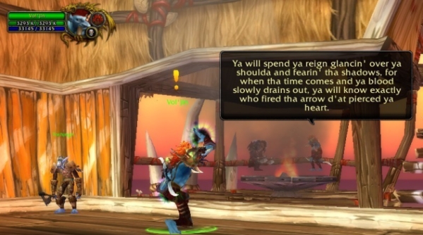 Vol’jin: Mas essa preocupação não é pra agora. Você ainda tem que aprender muito. Vá ajudar o povo Darkspear. Tenho certeza que falaremos mais tarde outra vez.